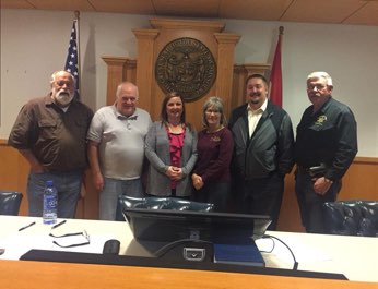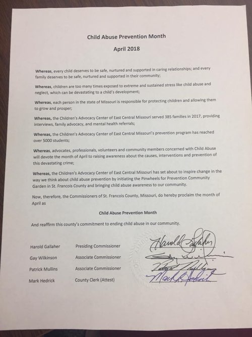 The County Commissioners of St. Francois County recognized April as Child Abuse Prevention Month during their weekly Commissioner’s meeting. They read and signed a proclamation to reaffirm this county’s commitment to ending child abuse in their community. Pictured from left to right: Associate Commissioner Gay Wilkinson, Presiding Commissioner Harold Gallaher, CAC Executive Director Kathy Carr, CAC Farmington Forensic Interviewer Kelly Tesson, Prosecuting Attorney Jerrod Mahurin, Sheriff Dan Bullock.